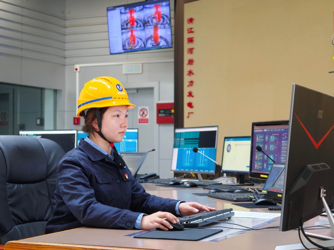 諶沁在隔河巖電廠中控室監(jiān)屏。(崔佳林 攝)